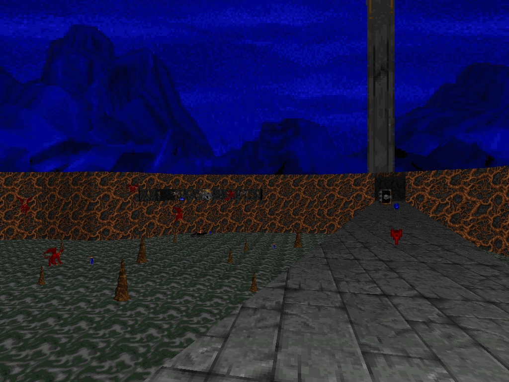 - Follow the stairs next to the previous secret to find an outdoor area. There is a bridge above a lake of sludge. To make things worse, there is a strong west wind. While you cross the bridge southward, you need to compensate the wind by running to the southeast. Straferunning is more effective but not necessary. At the other end, you will find the blue key along with the Wings of Wrath. Activate the wings and travel to the western end of the sludge lake. There is a ledge that leads to the Iron Lich room of the corresponding side. Collect the heavy ordnance there. You may want to return via the teleporter on the bottom of the sludge lake as it holds a Shadowsphere.