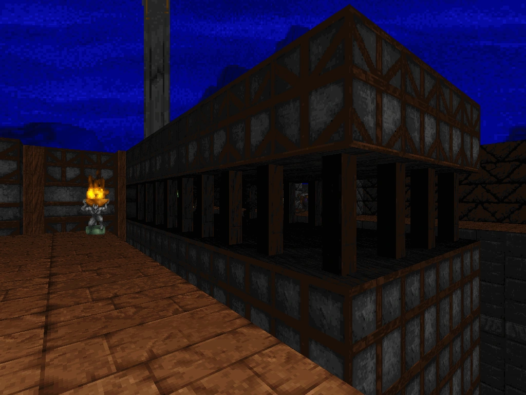 This is a fairly large level - a small town surrounded by solid defensive walls and a shallow moat with water. There are two large stone building and a heavily defended building made of dark metal plates, which conceals the exit. There are numerous Ophidians on the town's walls and they constantly snipe at the player. The streets themselves are infested with Sabreclaws.